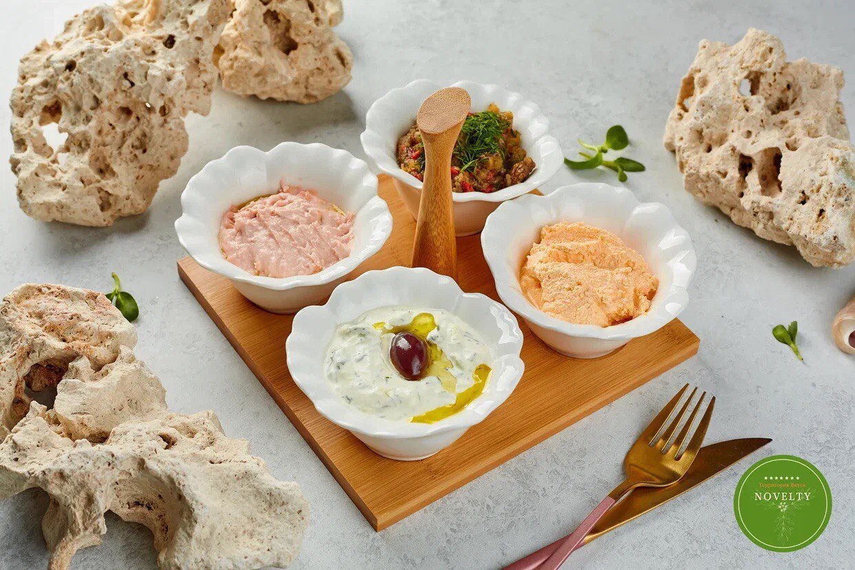 Соусы 4 вкуса с питой (дзадзики, сырный острый, баклажановый и аджика) 400 гр.
